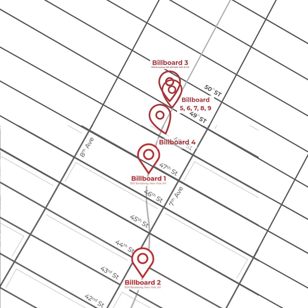 Notre panneau d’affichage mesure 31 pieds de haut x 55 pieds de large et est situé au 1560 Broadway, New York, NY (entre la 46e et la 47e rue).